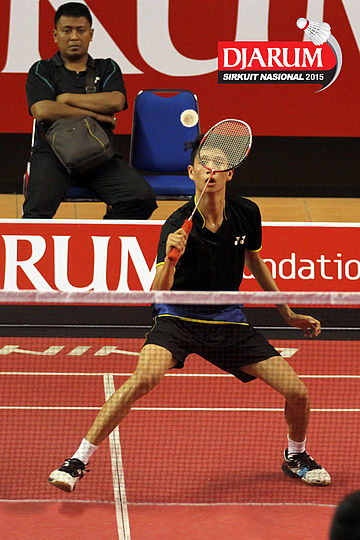 A. Rahmat Kurniawan (SGS PLN) mengembalikan shuttlecock ke arah Vega Vio (Mutiara Cardinal)