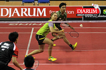 Akbar Bintang/Ristya Ayu (DJarum Kudus) bersiap menyambar pengembalian dari Stefan Indra/Variella Aprilsasi (Mutiara Cardinal/Tjakrindo Masters)