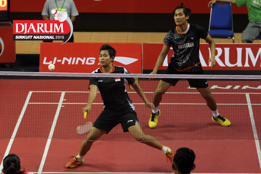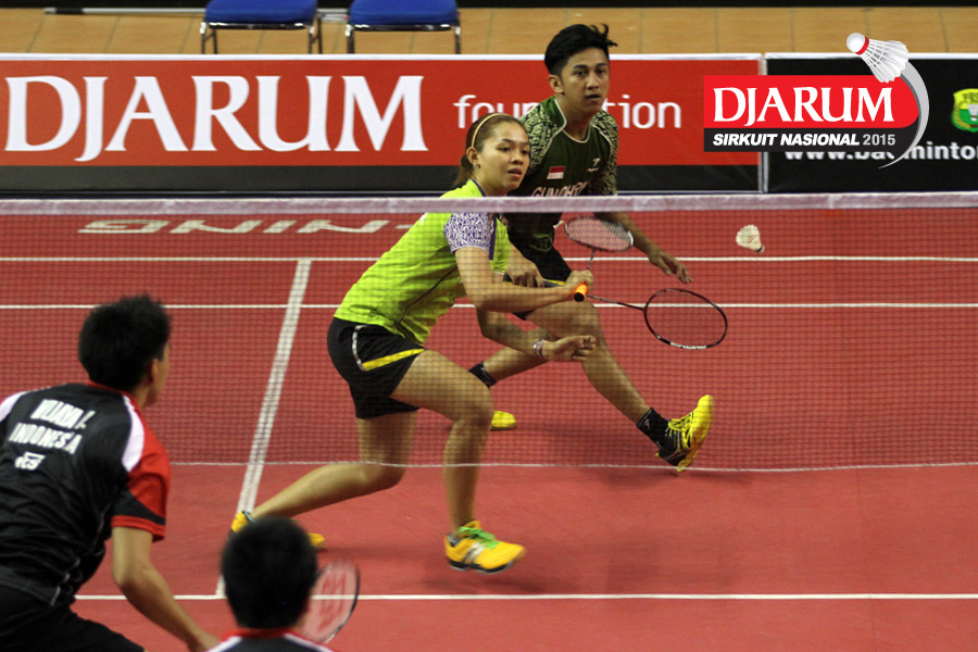 Kaisar Bobby/Delis Yuliana (Anugrah Jakarta) mengembalikan shuttlecock ke arah Ridho Akbar/Ery Octaviani (Halim/Jaya Raya)