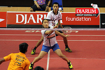 M. Rijal/Della Augustia (Djarum Kudus) menghadang pengembalian dari Ardiansyah Putra/Devi Tika Permatasari (Berkat Abadi)