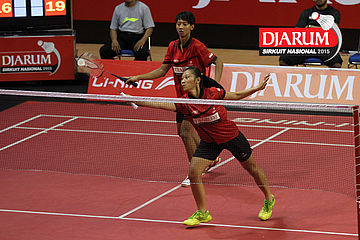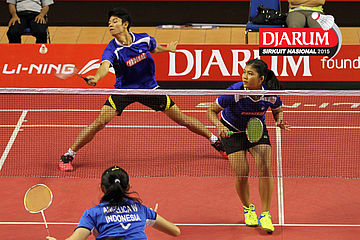 Akbar Gusti/Felicia Parmenas (Djarum Kudus) menghadang serangan yang dilepaskan Yufi Virgyanda/Anggi Maharani (Indocafe Medan/SKO Ragunan)