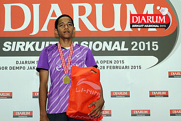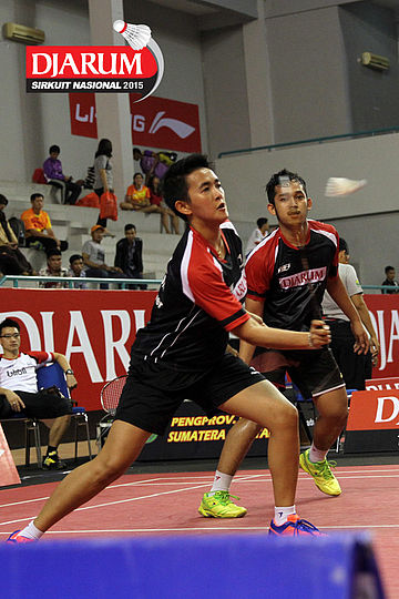 Alfandy Rizky/P. H. Mentari (Jaya Raya) mengembalikan shuttlecock ke arah Feisal Wiranto/Agatha Imanuela (Djarum Kudus)