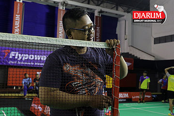 Dua Pekerja Saat Memasang Instalasi Logistik Djarum Sirkuit Nasional Li-Ning NTB Open 2017