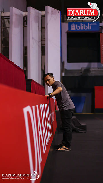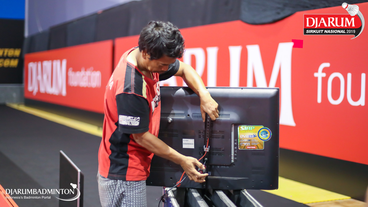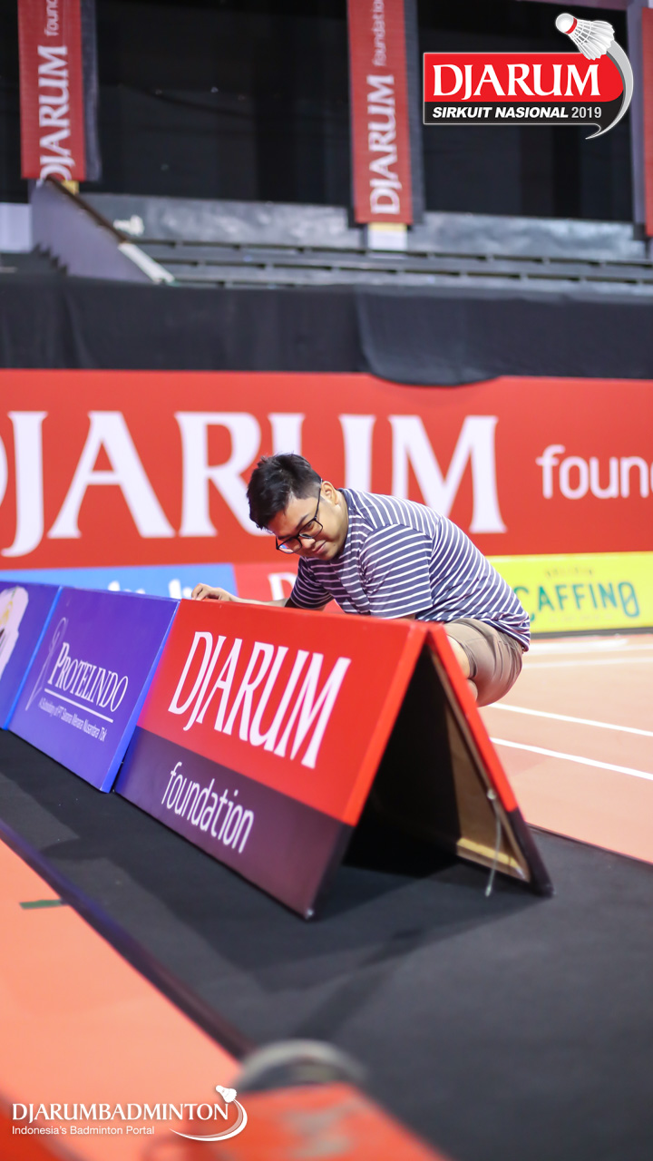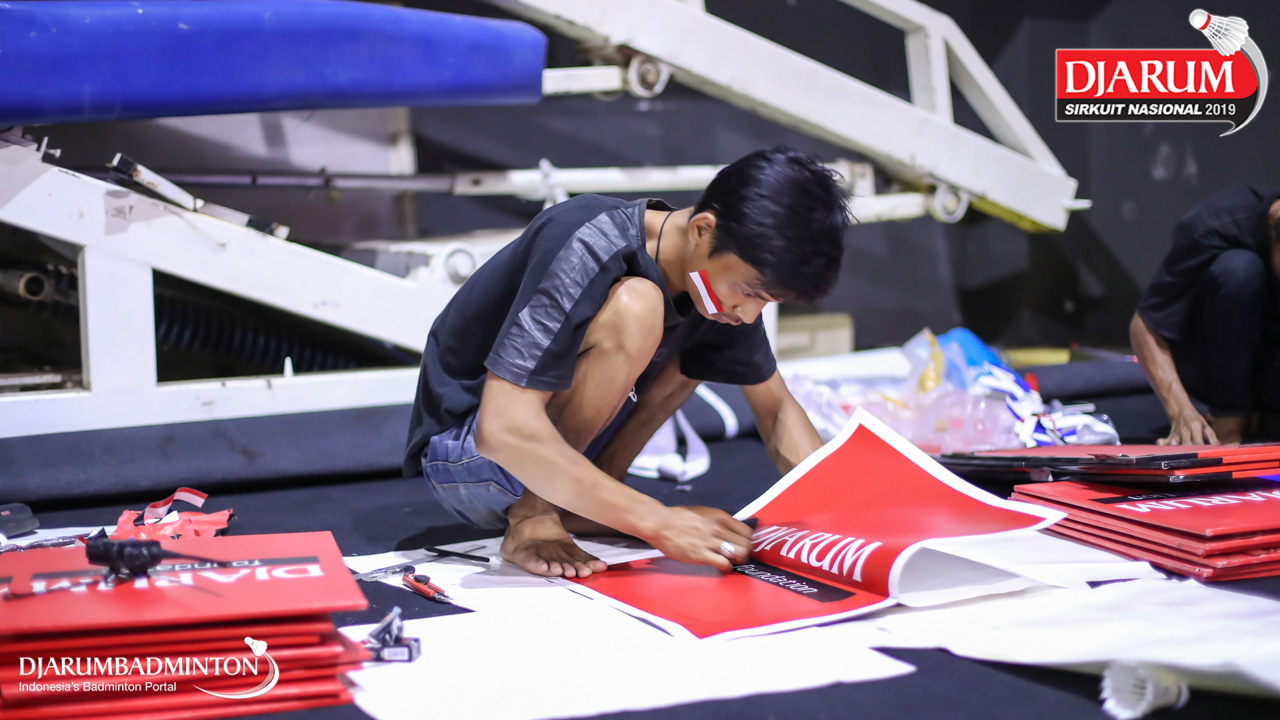 Salah satu pekerja sedang mengerjakan perlengkapan logistik Djarum Sirkuit Nasional Li Ning Nusa Tenggara Barat Open 2019