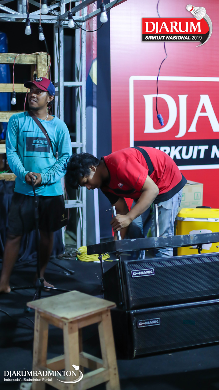 Dua orang pekerja sedang mengerjakan perlengkapan logistik Djarum Sirkuit Nasional Li Ning Nusa Tenggara Barat Open 2019