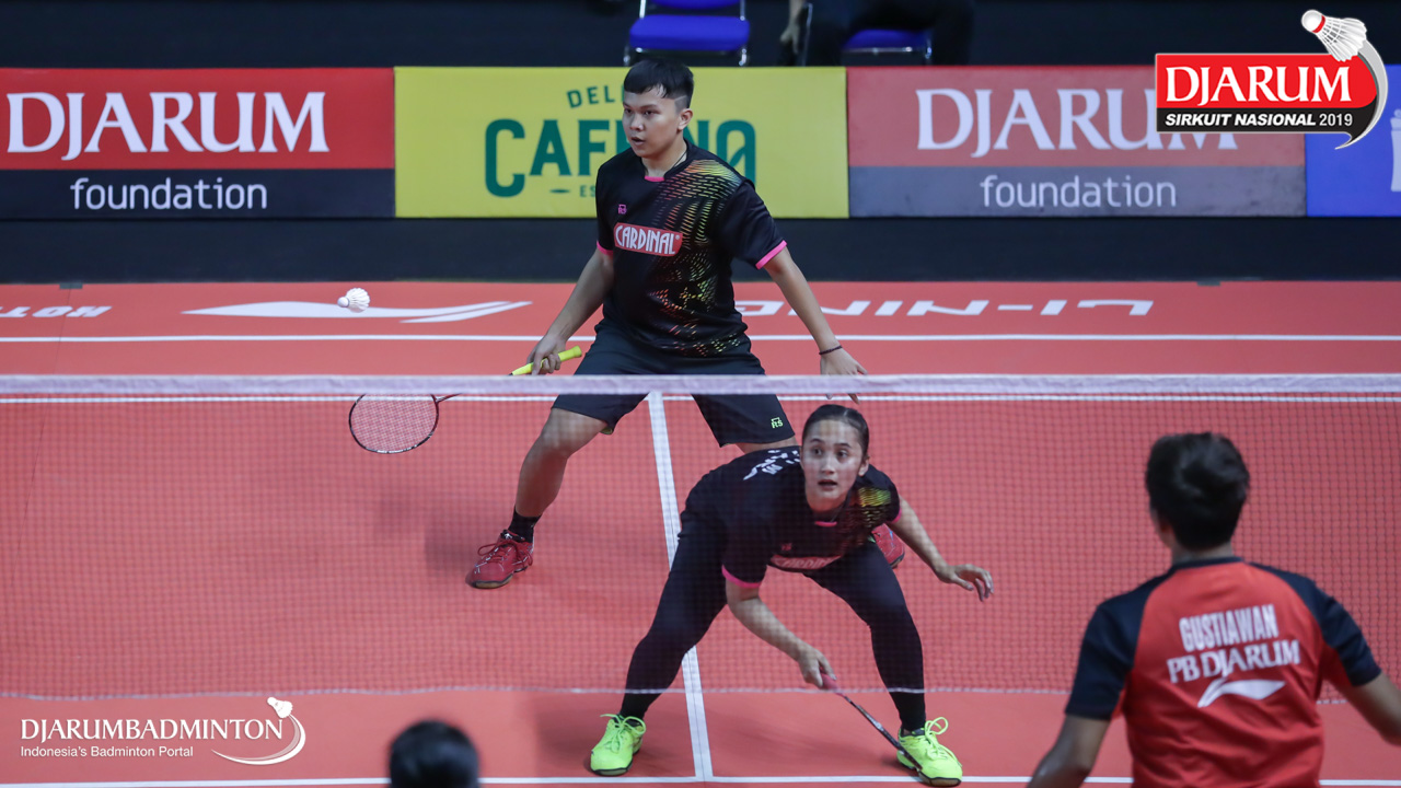 Alif Rafsyah Mauthuthihona+Monika Insany (Mutiara Cardinal, Bandung) mengembalikan shuttlecock