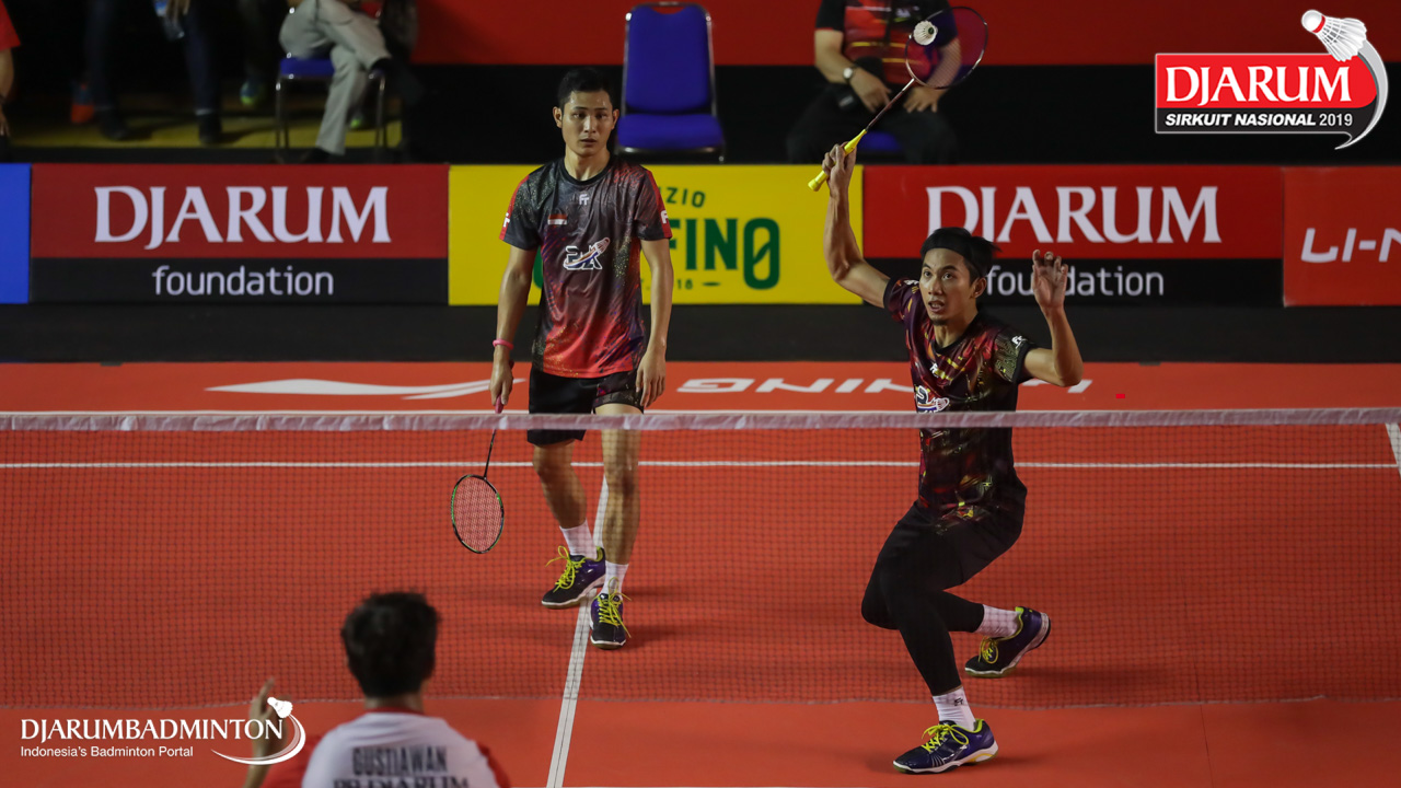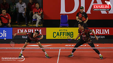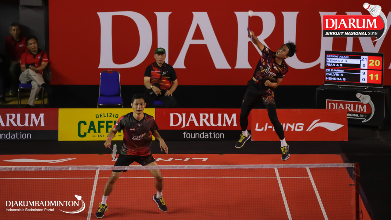 Kenas Adi Haryanto+Rian Agung Saputro (Berkat Abadi, Banjar) menyambar shuttlecock