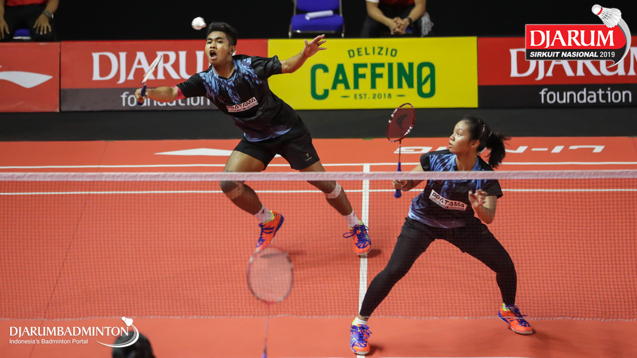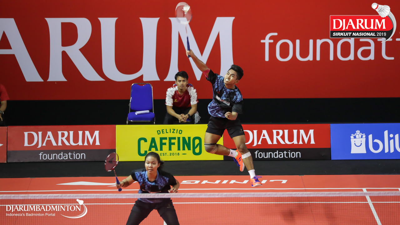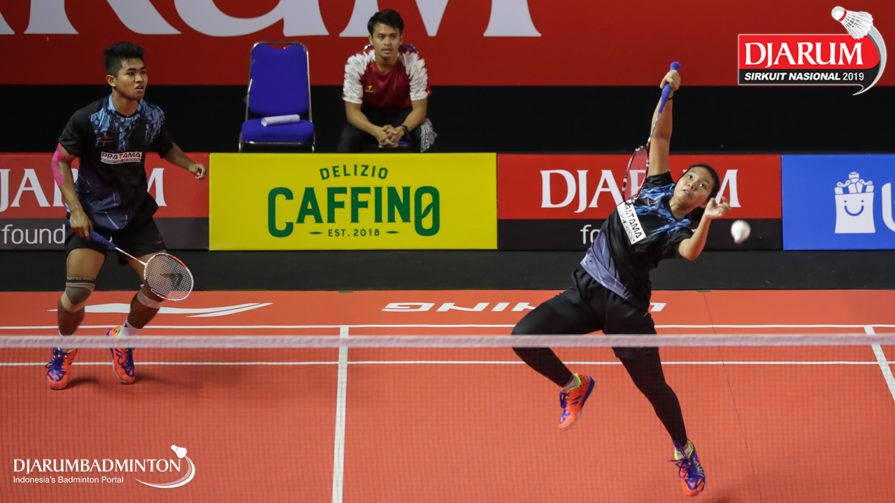 Muliadi Rizka Saputra+Trisma Arlisa Septiana (Pratama Badminton Academy, Sby) menyambar pengembalian