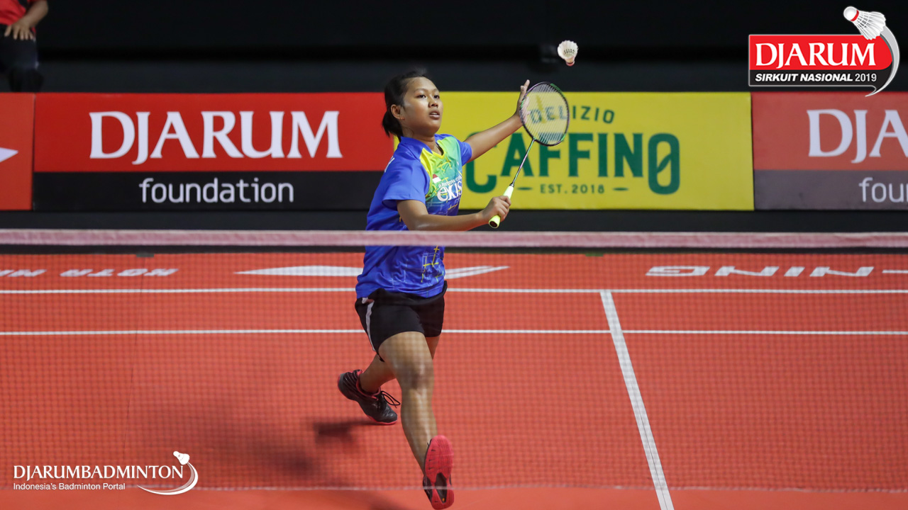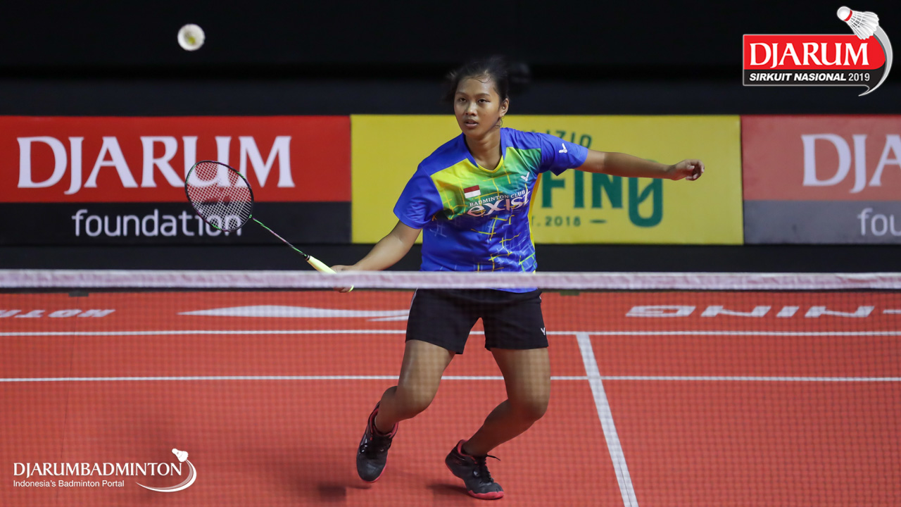 Tiara Ayuni Wulandari (Exist Badminton Club) bersiap menyambut shuttlecock