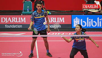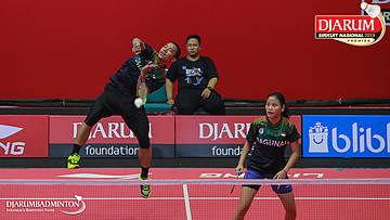 Sandy Arifa Putra+Vania Dyla Pratiwi (PB Victory Bogor, Jaktim+Jaya Raya Jakarta) bersiap menyambar pengembalian
