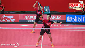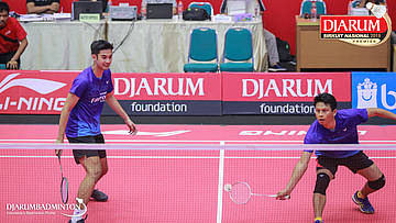 Riyanto Subagja+Sapto Susilo (Pertamina Fastron, Jakut+PB Trinox Badminton Club, Jaktim) menyambut shuttlecock
