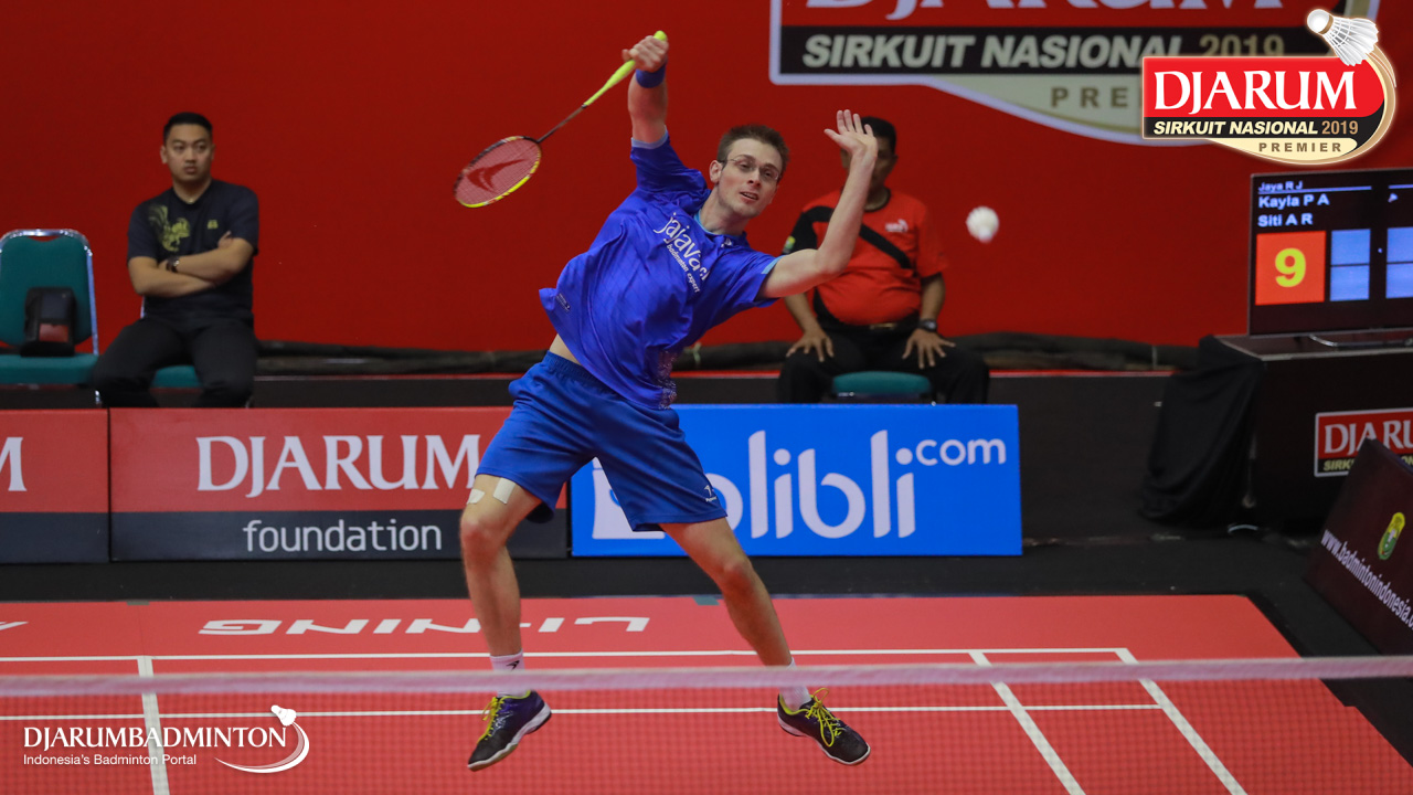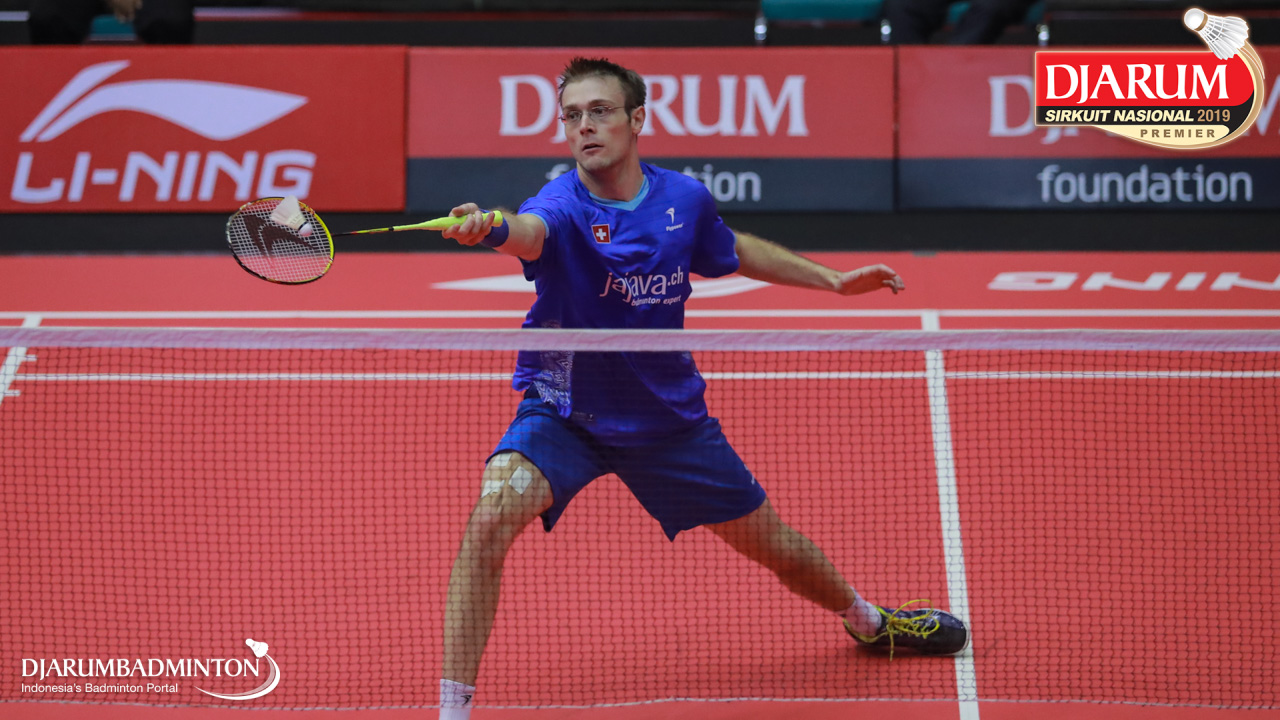 Dominic Jan Tripet (Swiszterland) menyambut shuttlecock