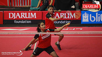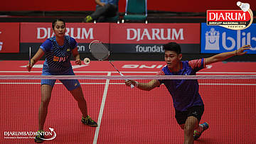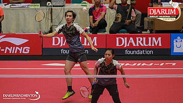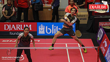 Asghar Herfanda+Sang Ayu Putu Kharisma Maharani (PB Djarum, Kudus) bersiap menggapai pengembalian