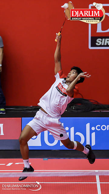Bagas Kristianto Nugroho (PB Djarum, Kudus) menggapai shuttlecock