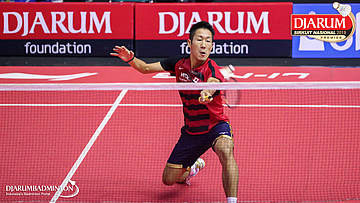 Inokuma Shintaro (Japan) mengembalikan shuttlecock