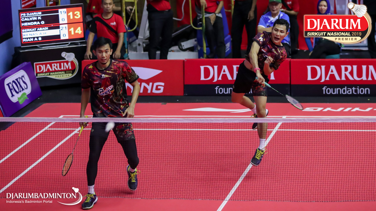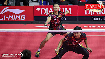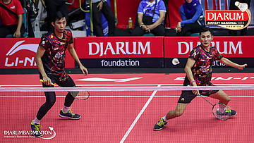 Kenas Adi Haryanto+Rian Agung Saputro (Berkat Abadi, Banjar) mengembalikan shuttlecock