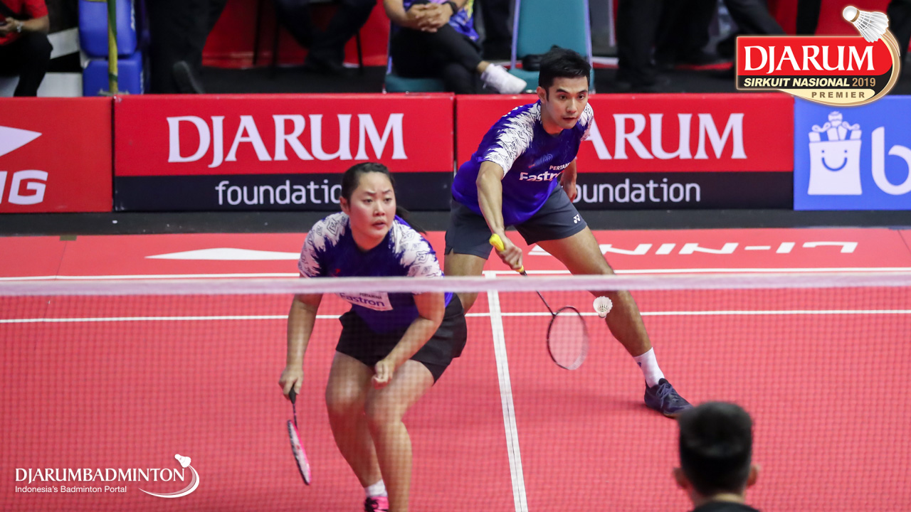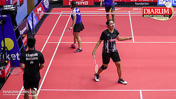 Teges Satriaji Cahyo Hutomo+Lanny Tria Mayasari (Jaya Raya Jakarta) bersiap menggapi pengembalian