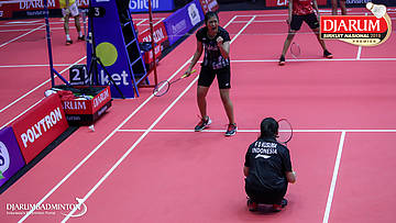 Febby Valencia Dwijayanti Gani+Metya Inayah Cindiani (Pelatnas) terjatuh saat berusaha mengembalikan serangan