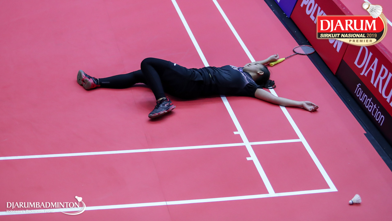 Febriana Dwipuji Kusuma (Pelatnas) terjartuh saat berusaha menggapai shuttlecock