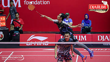 Ivan Adi Cahyono+Vincentius Suwarland (PB Djarum, Kudus) menyambar pengembalian
