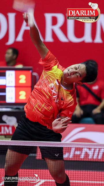 Agripina Primarahmanto Putera+Muhammad Juan Elgiffani (Berkat Abadi, Banjar+PB Victory Bogor, Jaktim) mengembalikan shuttlecock