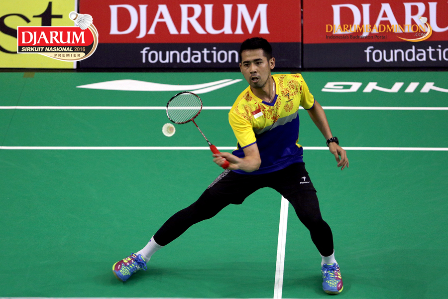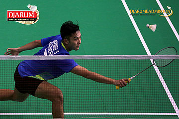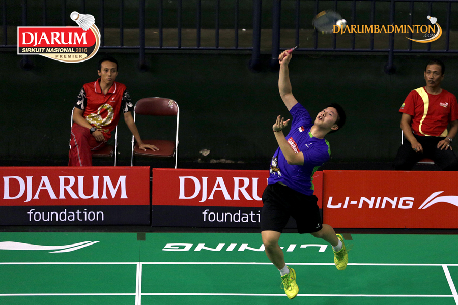 Andrew Susanto (Sarwendah) berhasil menggapai shuttlecock