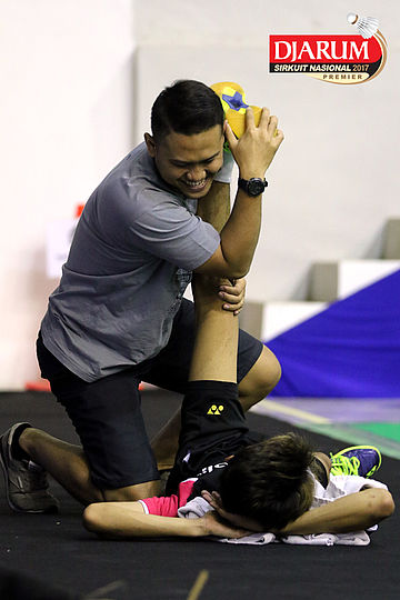 Wisnu Yuli (Djarum Kudus) Dibantu Fisiotrapis Melakukan Peregangan Usai Berlatih