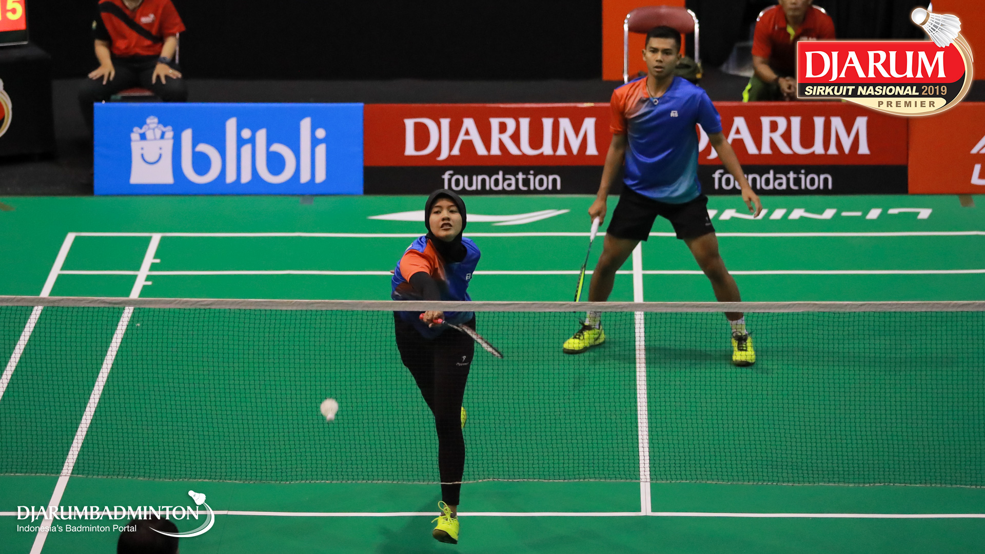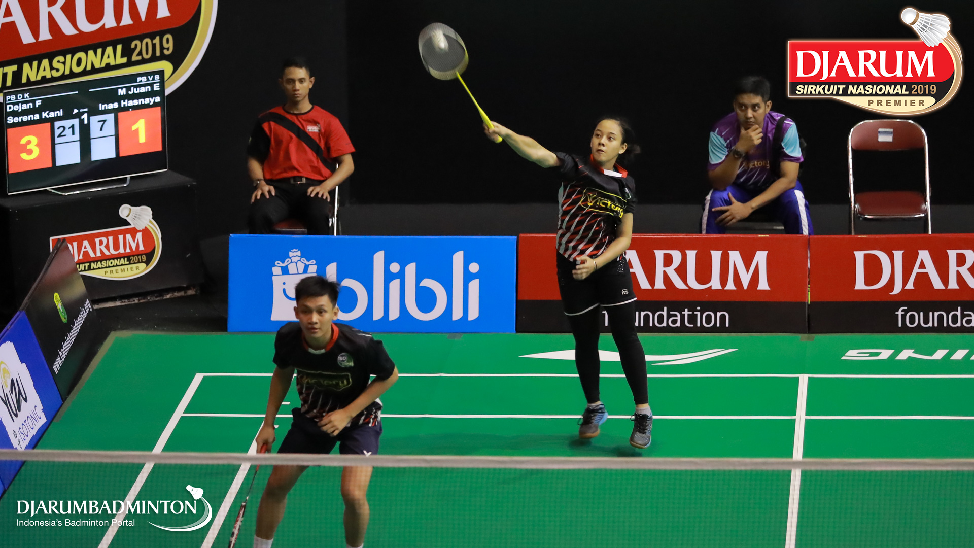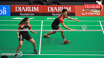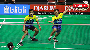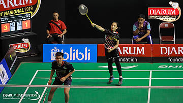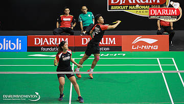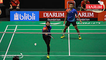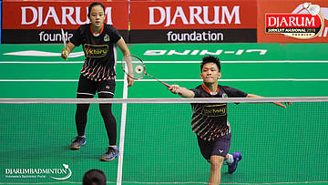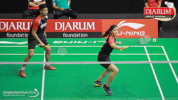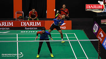 Dejan Ferdinansyah+Serena Kani (PB Djarum, Kudus) menyambut shuttlecock