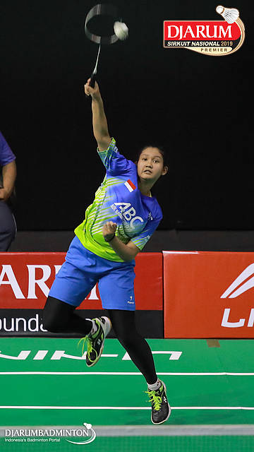 Alia Nur Pathonah (Ade Badminton Club, Bandung) bersiap melepaskan serangan