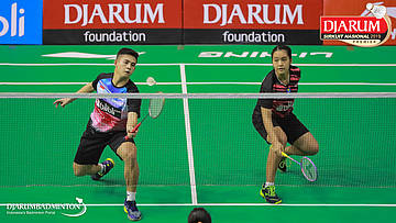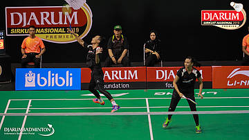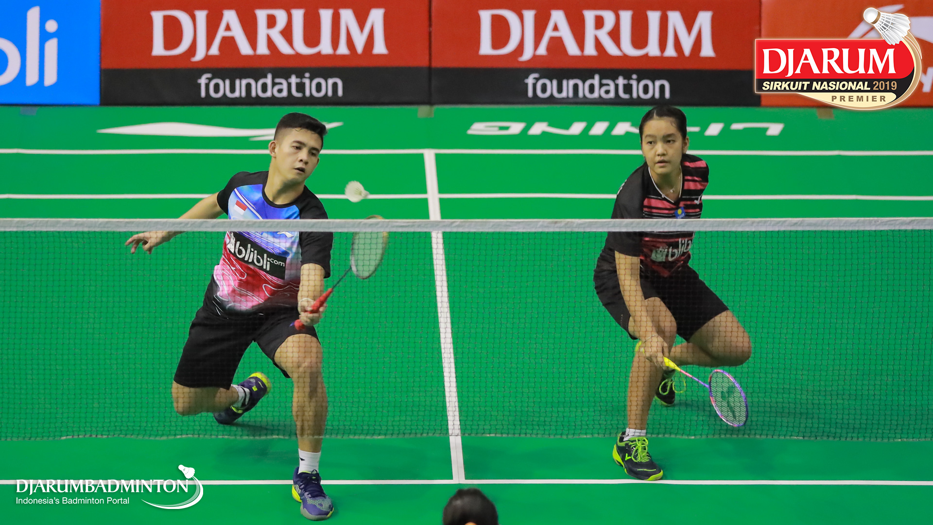 Dwiki Rafian Restu+Nita Violina Marwah (Pelatnas) bersiap menyambar shuttlecock