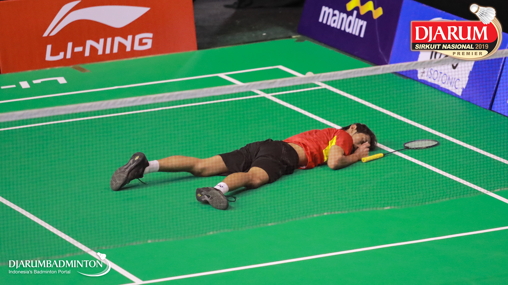 Wisnu Yuli Prasetyo (Pertamina Fastron, Jakut) terjatuh saat gagal mengembalikan serangan