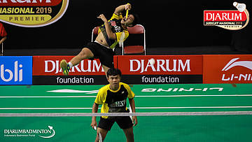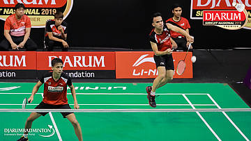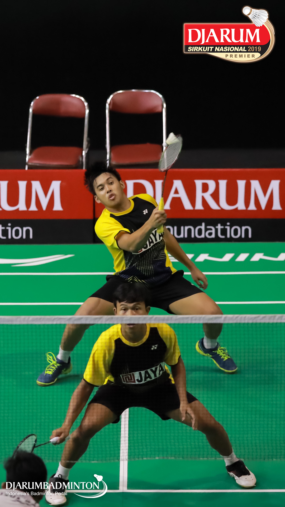 Alif Atallah Juan Setiawan+Teges Satriaji Cahyo Hutomo (Jaya Raya Jakarta) mengembalikan shuttlecock