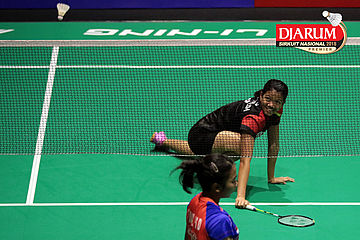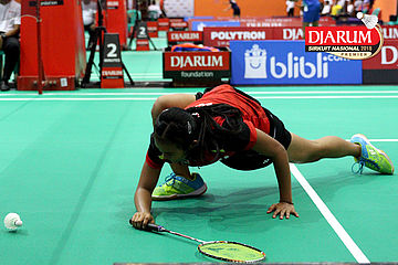 Nandini Putri Arumni (PB Djarum Kudus) Harus Terjatuh Saat Berusaha Mengembalikan Shuttlecock