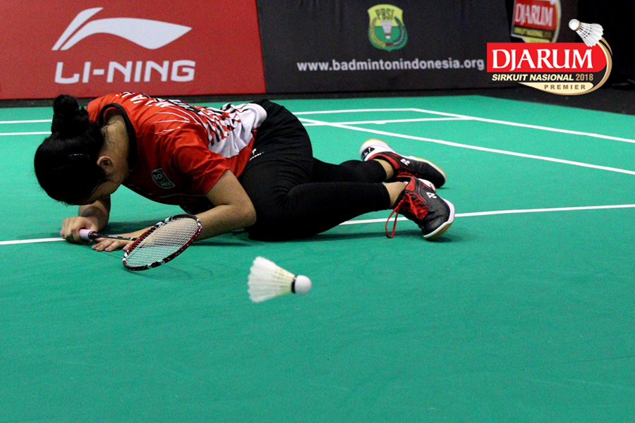 Melsya Nur Fitriani (PB Victory Bogor) Terjatuh Saat Berusaha Menggapai Pengembalian