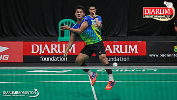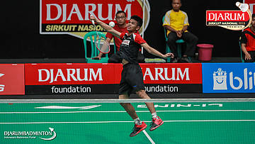Muhammad Iqbal (Exist Badminton Club) melepaskan serangan
