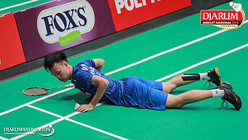 Yudha Putra Pramudia (Mutiara Cardinal, Bandung) terjatuh saat berusaha menggapai pengembalian