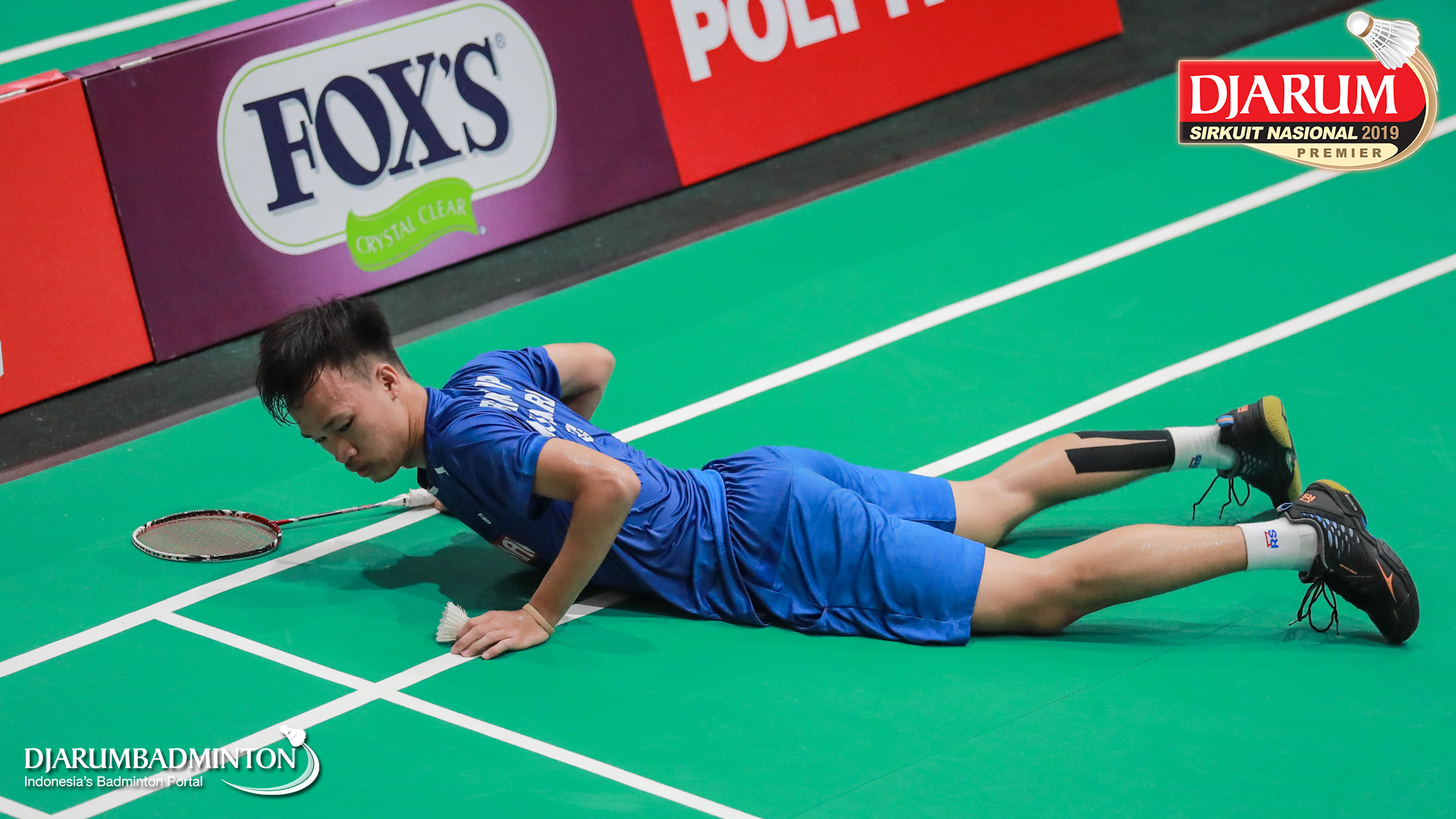 Muhammad Iqbal (Exist Badminton Club) berusaha melakukan pertahanan