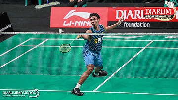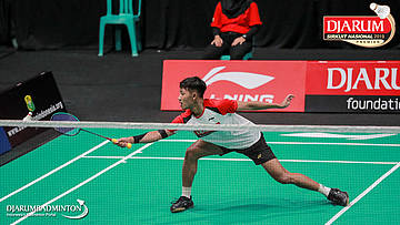 Andi Fadel Muhammad R (PB Victory Bogor, Jaktim) mengembalikan shuttlecock