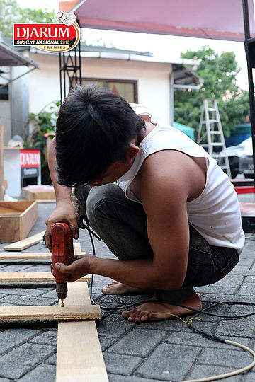 Salah Satu Pekerja Sedang Mengebor Perangkat Booth Merchandise Djarum Sirkuit Nasional Li-Ning Premier Jawa Timur Open 2016.