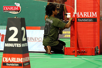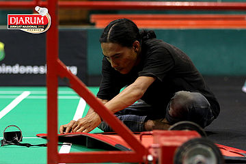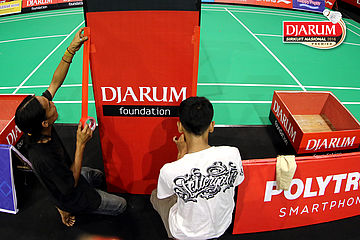 Seorang Pekerja Terlihat Mengatur Dekorasi Djarum Sirkuit Nasional Li-Ning Premier Jawa Timur Open 2016.