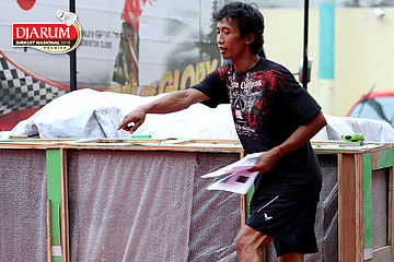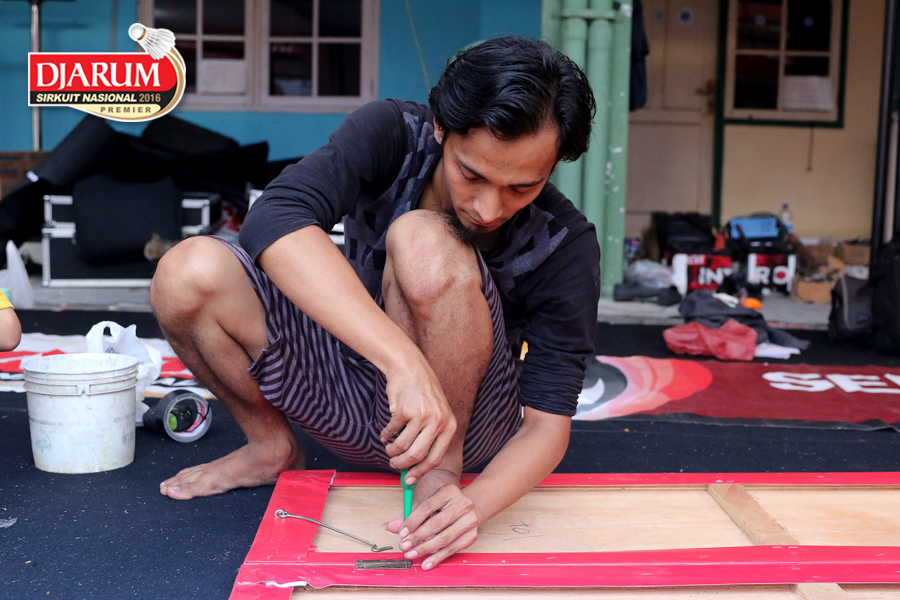 Salah Satu Pekerja Sedang Memasang Lantai Booth Merchandise Djarum Sirkuit Nasional Li-Ning Premier Jawa Timur Open 2016.