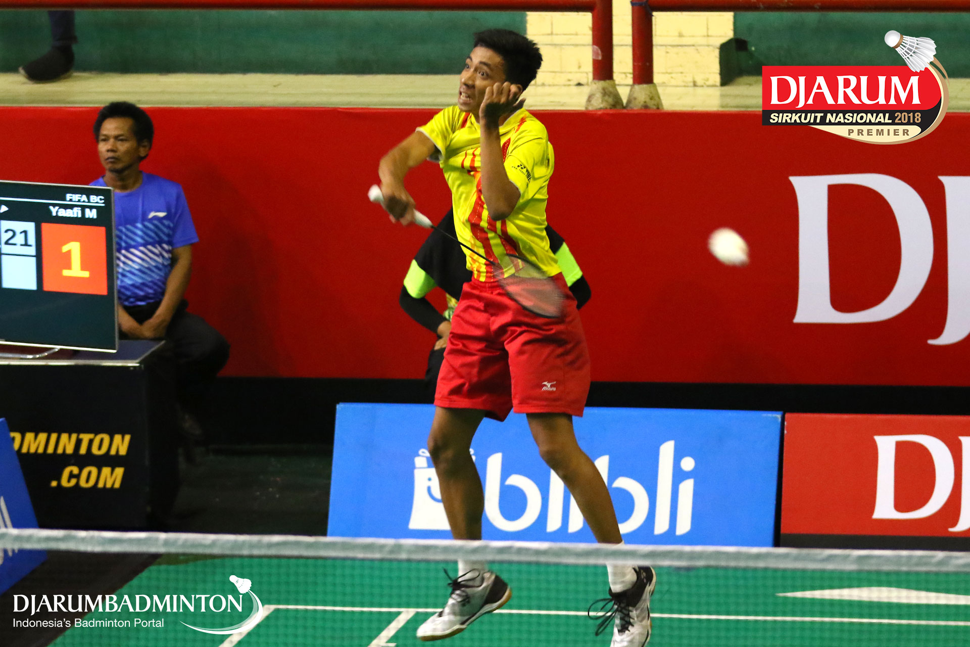 Aldy Firmanda (PB Djarum, Kudus) menyambar shuttlecock