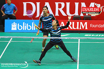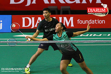 Andrei Adistia/Maria Febe Kusumastuti (PB Djarum, Kudus) bersiap menyambut serangan