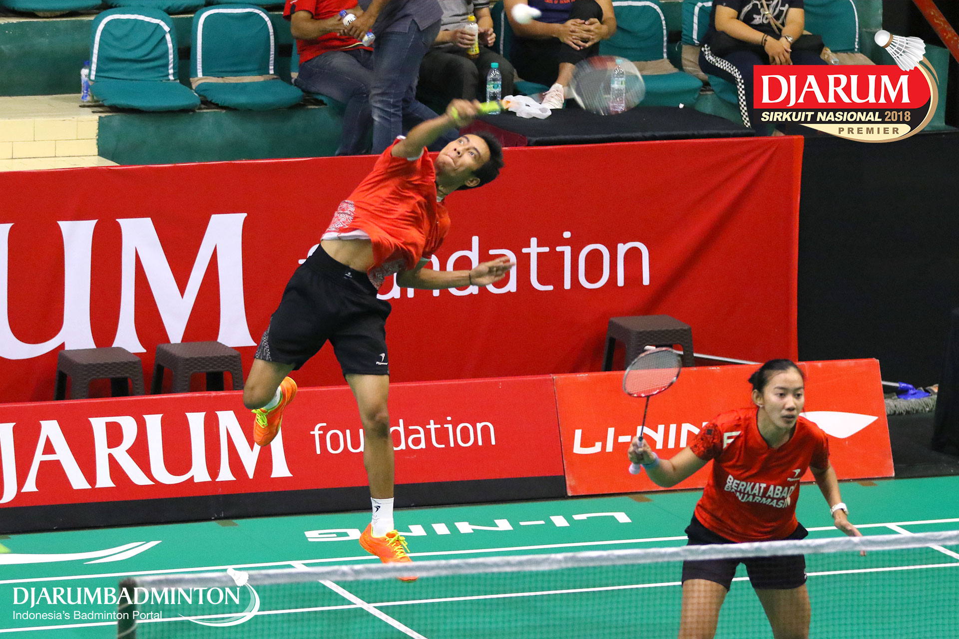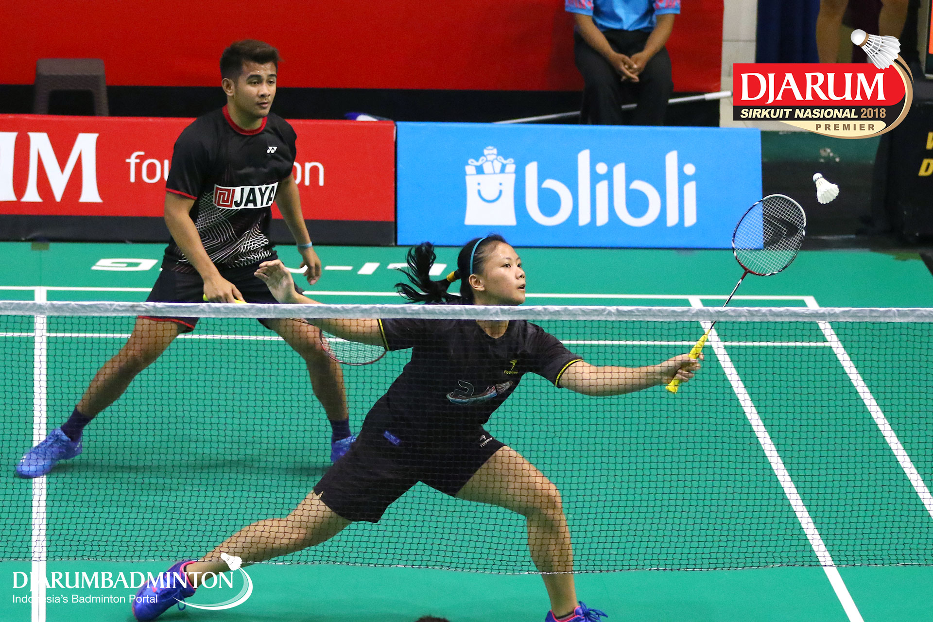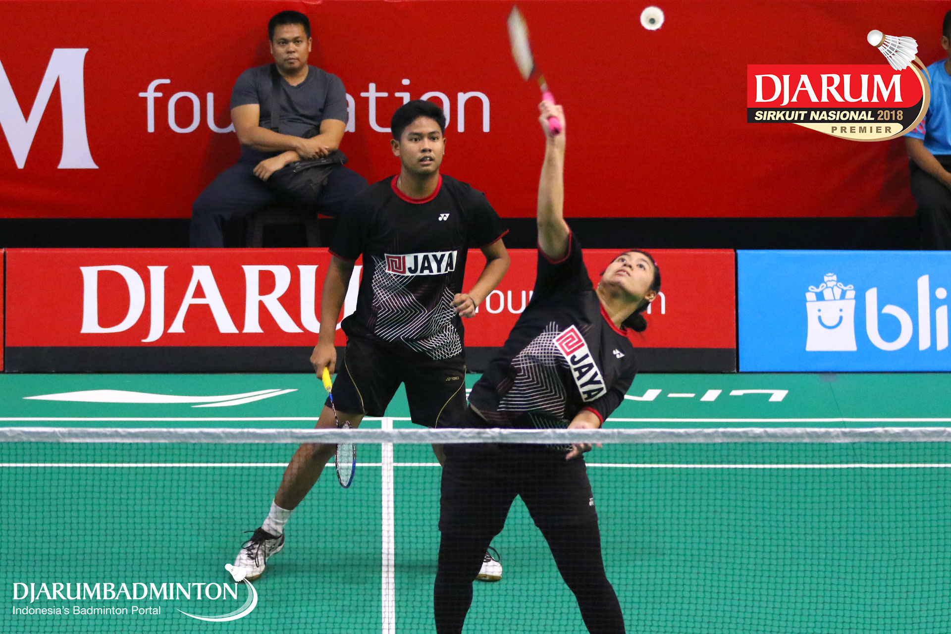 Irfan Fadhillah/Shela Devi Aulia (Jaya Raya Jakarta, Jakpus) berisp menyambar shuttlecock