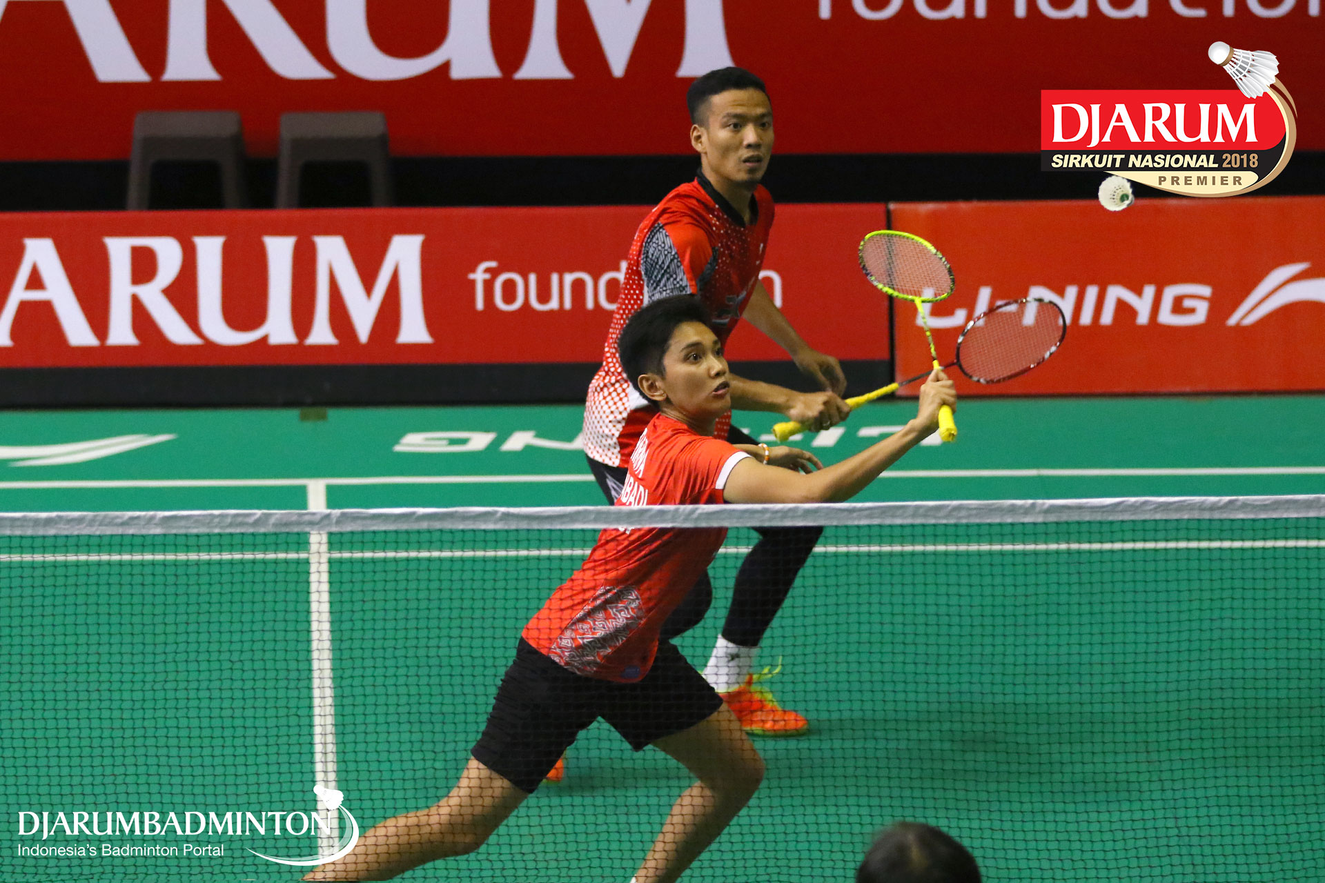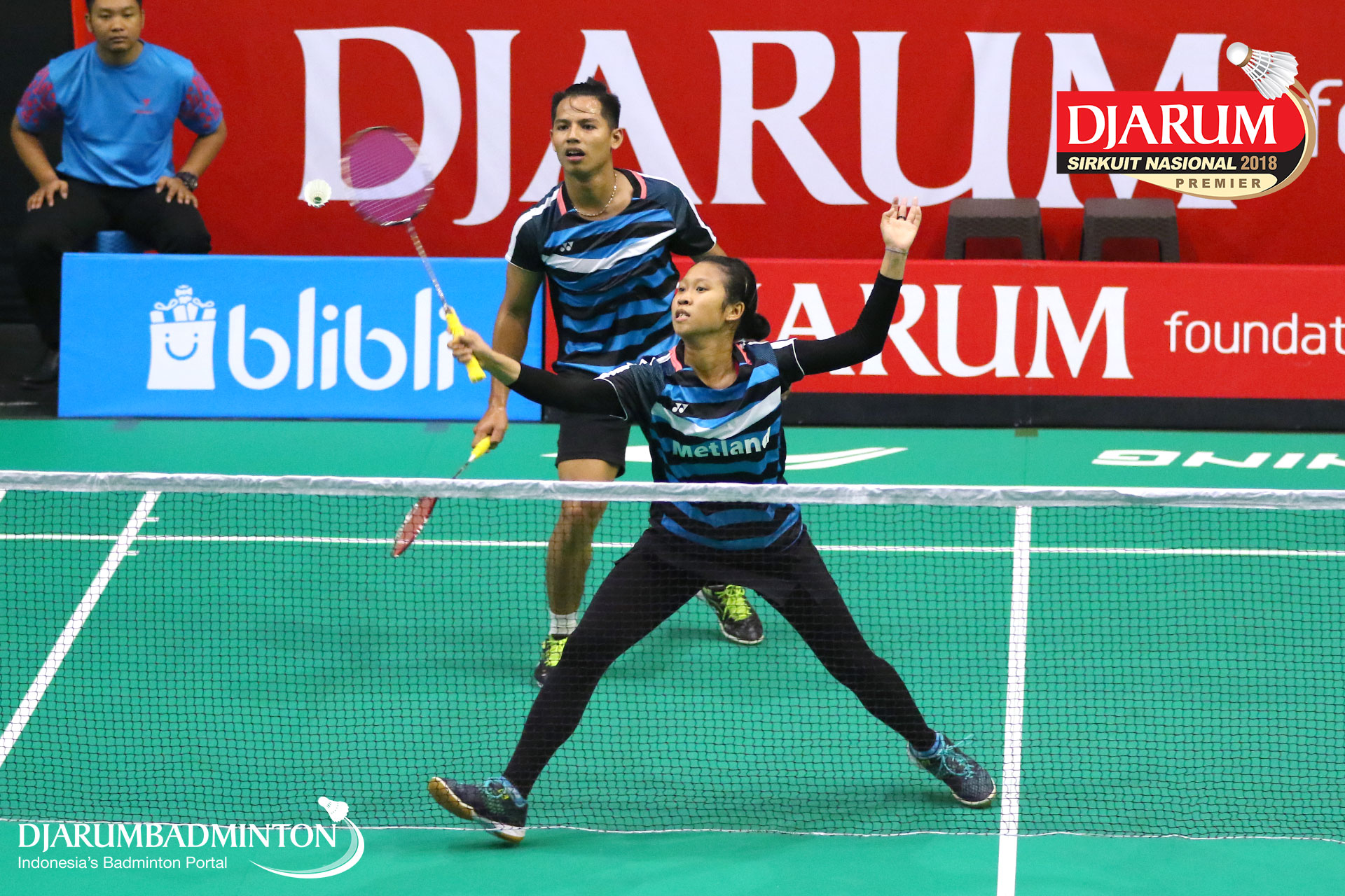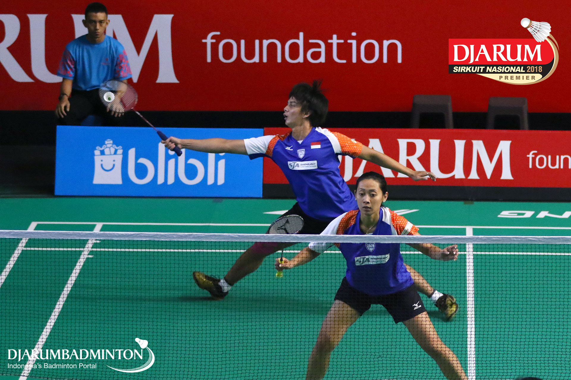 Irfan Fadhillah/Shela Devi Aulia (Jaya Raya Jakarta, Jakpus) berisp menyambar shuttlecock