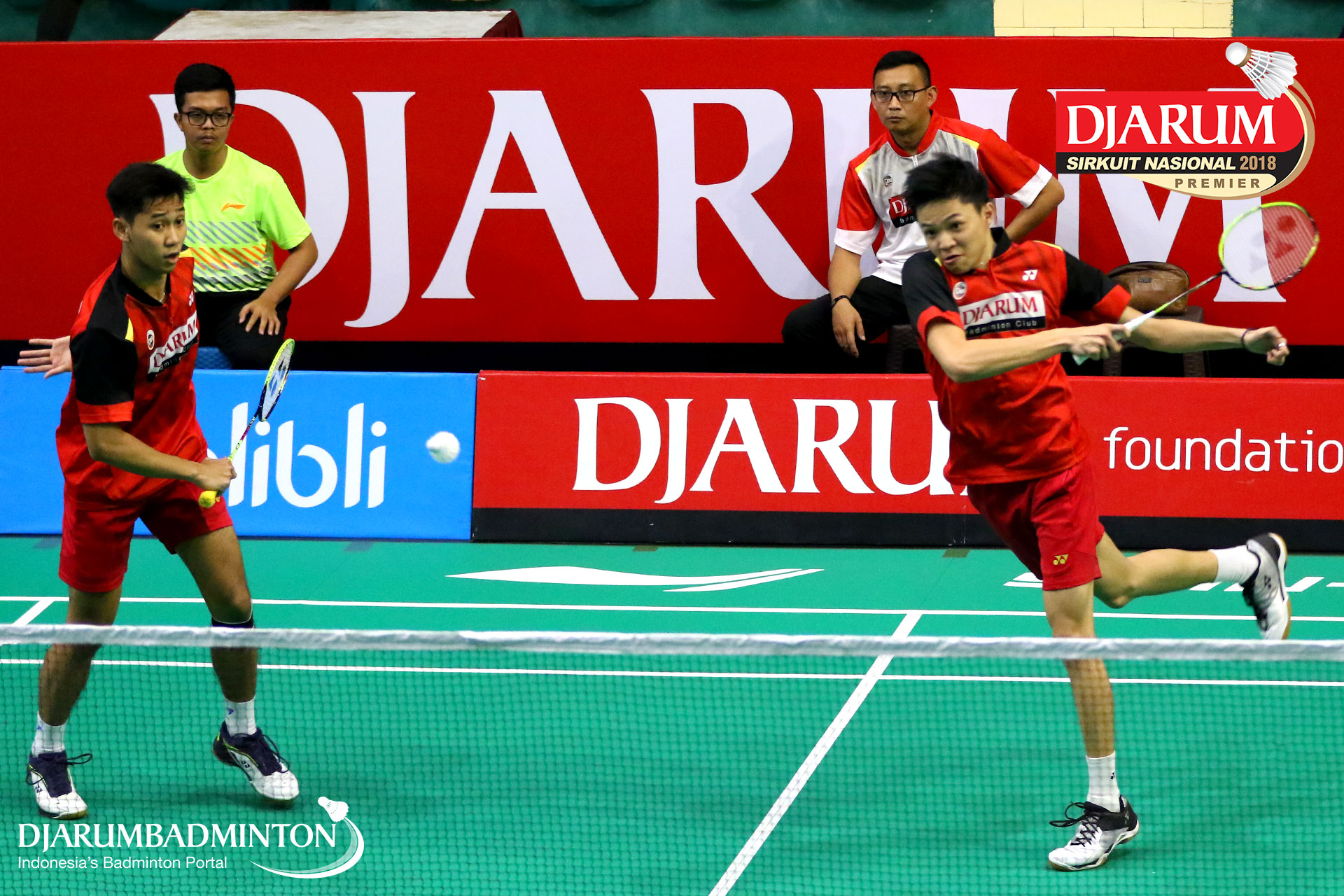 Bobby Setiabudi/Muhammad Aldo Apriyandi (PB Djarum, Kudus) mengembalikan shuttlecock
