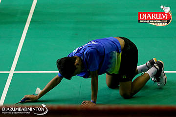 Nur Yahya Ady Velani (Pratama Badminton Academy, Sby) terjatuh saat berusaha menggapai pengembalian