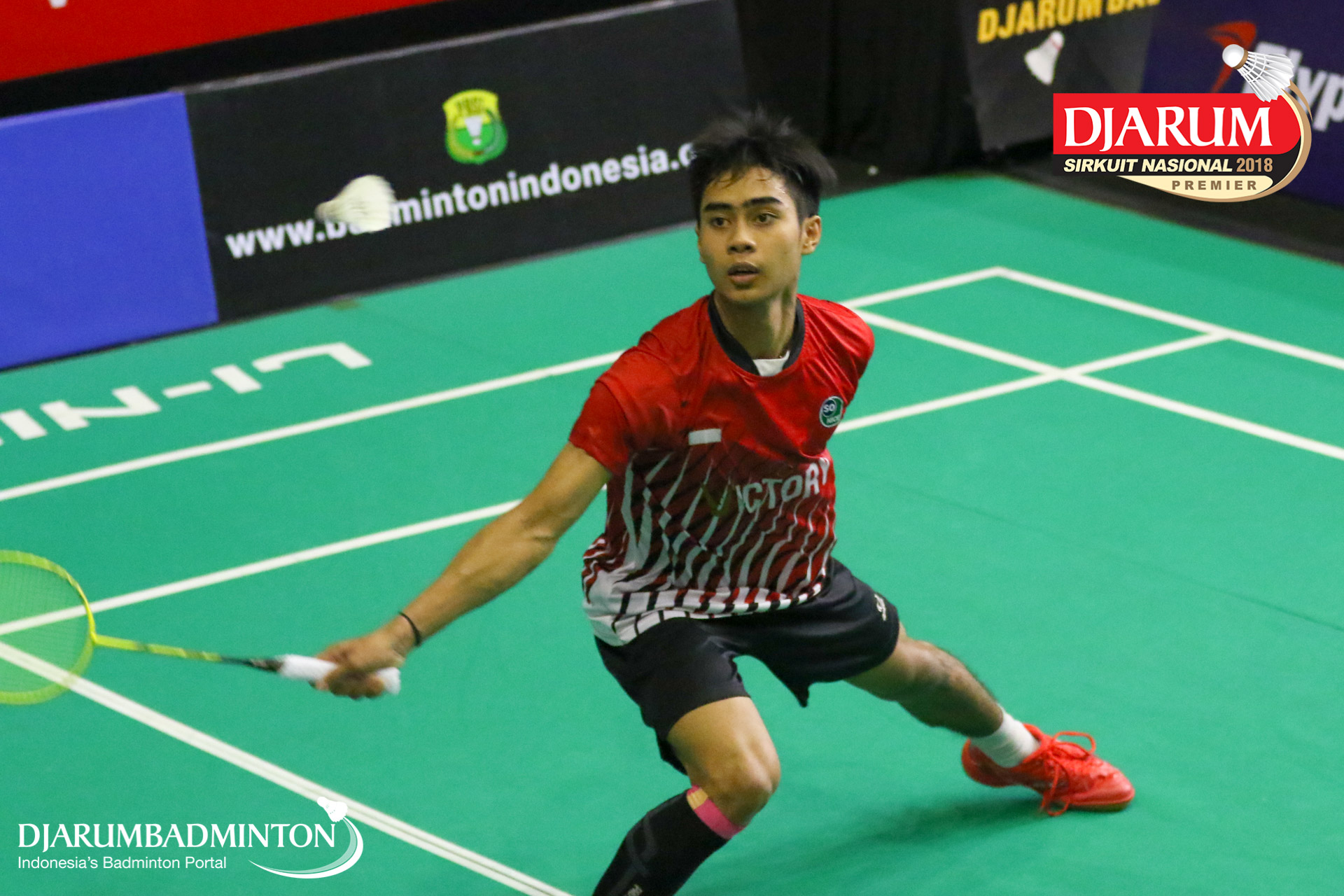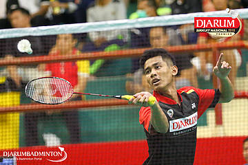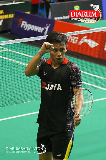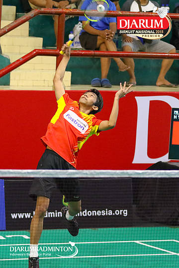 Wisnu Yuli Prasetyo (Pertamina Fastron, Jakut) menyambut shuttlecock
