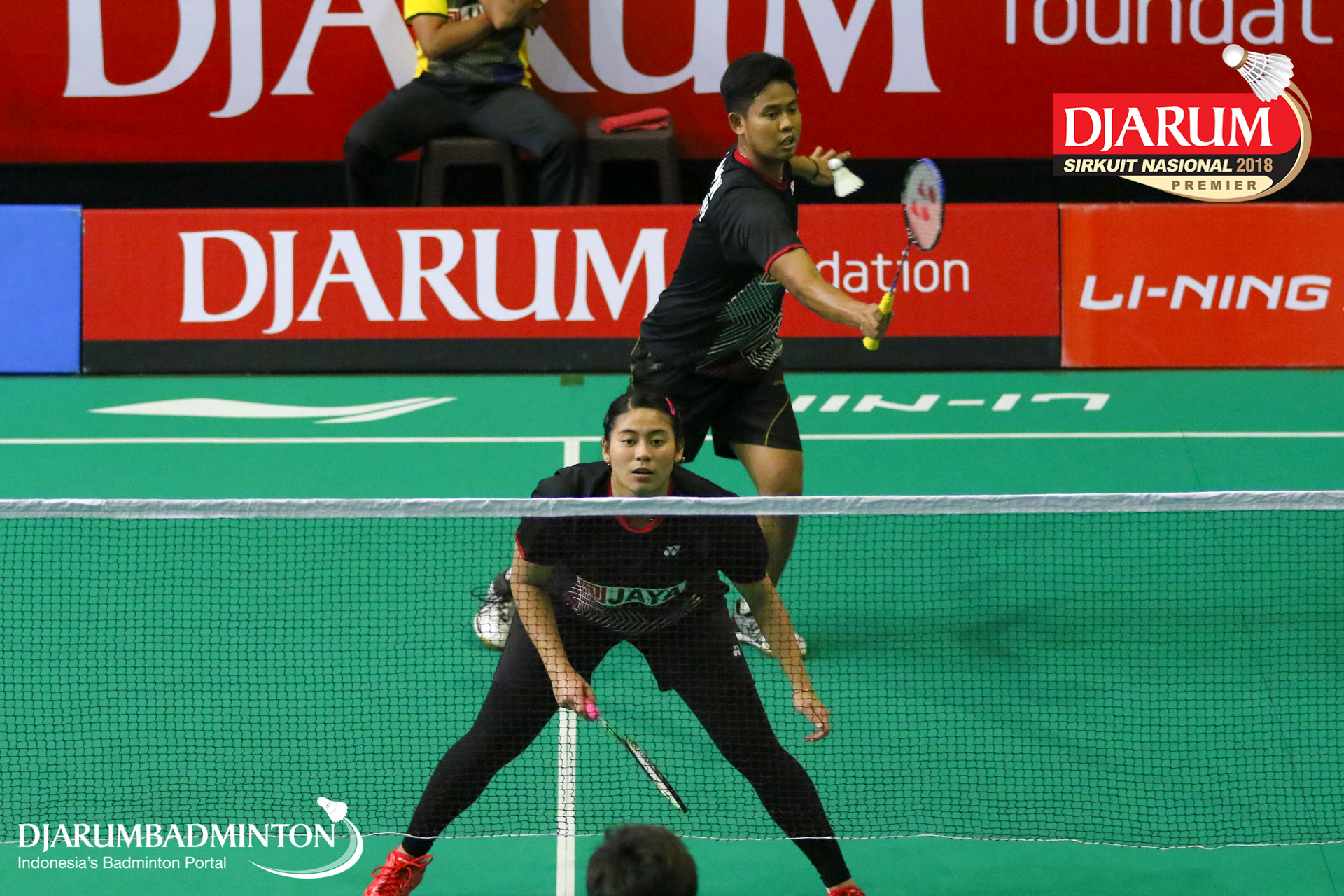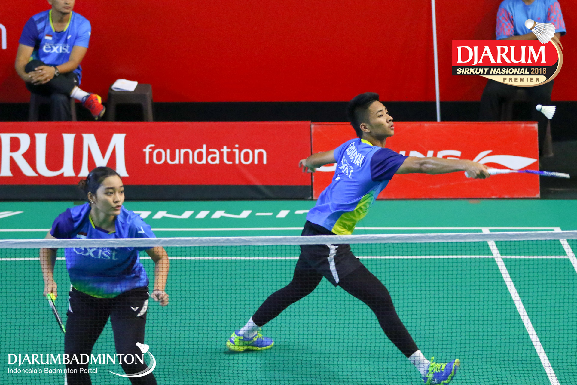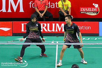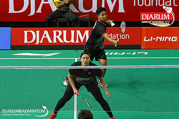 Dejan Ferdinansyah+Tsavanne Bethalia Putri Mertoso (Exist, Jakarta) menyambut shuttlecock