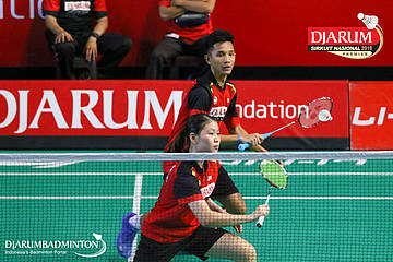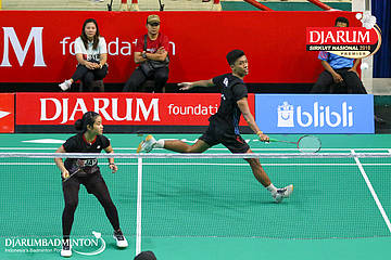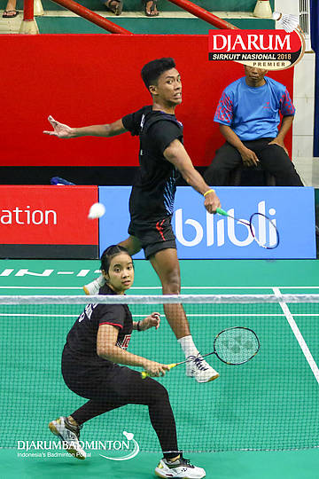 M. Lucky Andres Apriyanda+Helena Ayu Puspitasari (PB Djarum, Kudus) berusaha menyambut serangan